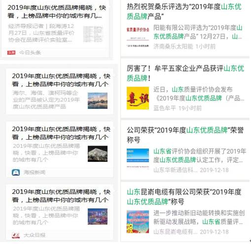 2019年度山东优质品牌认定工作也受到了今日头条、大众网、山东财经报道、海报新闻等社会媒体的广泛关注,这些媒体网站或公众号也相继发布了相关信息,舆情热度高,传播量大,有效提升了山东优质品牌认定工作的影响力。同时,济南桑乐太阳能、宏安集团、宏源防水、山东格瑞德集团等企业纷纷发布入选喜讯。争创山东优质品牌,提升产品和服务质量水平,已经成为我省广大企业的共识。通过开展山东优质品牌认定工作,进一步推动了质量强省和品牌战略的深入实施,为促进我省经济发展和产业结构调整、扩大就业、促进和谐社会发展发挥了重要的作用。